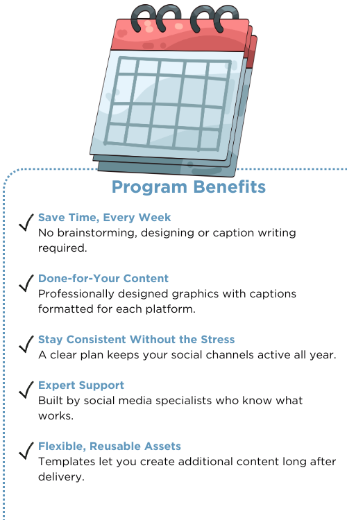 Social media shouldn’t feel like a weekly fire drill. This program gives you ready-to-use content, clear direction and expert support so your team can stay consistent without added workload.